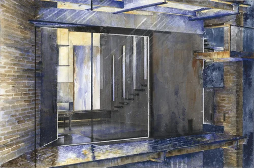 The Storyboards depict a visual narrative of architectural atmospheres – the combined sensory effect of its materials, textures, details, lights and shadows – in mixed media perspective drawings. Each scene is imbued with a unique quality of ambient light given by the time and weather conditions during a period of day turning to night.