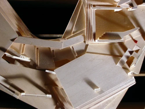 Born out of diagrams that analyze and network topographical traits by mapping the flow of water down the sloping, rocky site, this proposal for a “Froebel Kindergarten” responds to the landscape, rather than imposing upon it, maintaining the interconnection between children and nature that is key to its program. Through the use of a tectonic of imbricated plates allowed to “flow” across the site, forming streams and pooling against the rock outcroppings, the building behaves like the land while maintaining a unique stepped and terraced interior landscape.