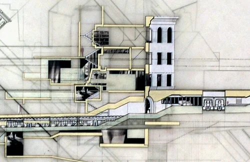 The Collaged City Drawings, which overlay plan and section, are the first conceptual designs for Shared Stories. A collection of urban elements such as stairs, subway entrances, walls, balconies, archways, walkways, and streets placed within the collaged composition of the drawings generate the project’s basic forms and spatial prototypes.